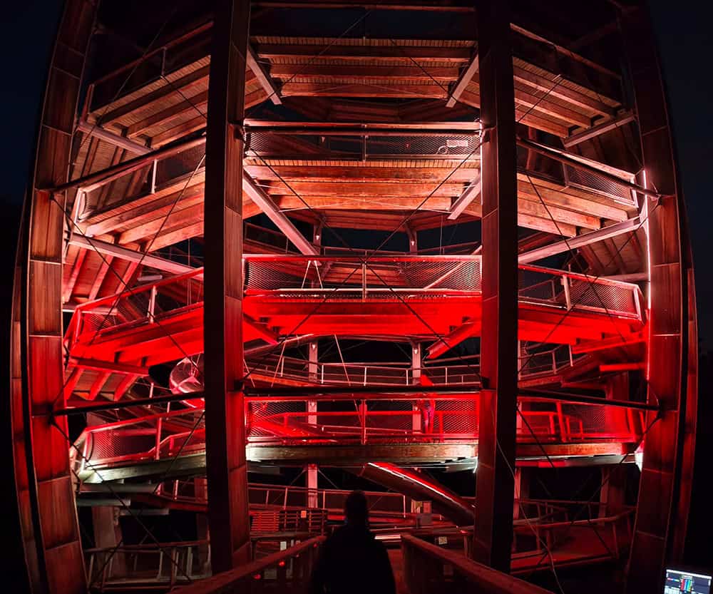Gemeinsam mit unserem Partner vor Ort haben wir den Aussichtsturm und den Pfad in verschiedenen Lichtszenarien getestet. Nur durch reale Probestellungen lässt sich die Wirkung der Lichtinszenierung im Waldraum präzise beurteilen.
