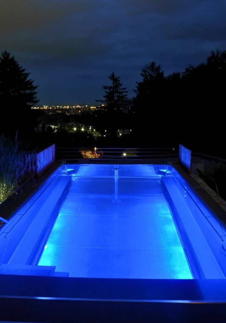 Die Scheinwerfer schließen dabei durch magnetische Halterung mit der Poolwand bündig ab. Sie tauchen den Pool in ruhiges, klares Licht, modellieren Wasser, Fliesen und Tiefe – und schaffen genau die Atmosphäre, die man sonst nur aus Boutique-Hotels kennt. Dank moderner LED-Technik, langlebiger Materialien und smarter Steuerung bleibt das Erlebnis dabei leise, effizient und zuverlässig.